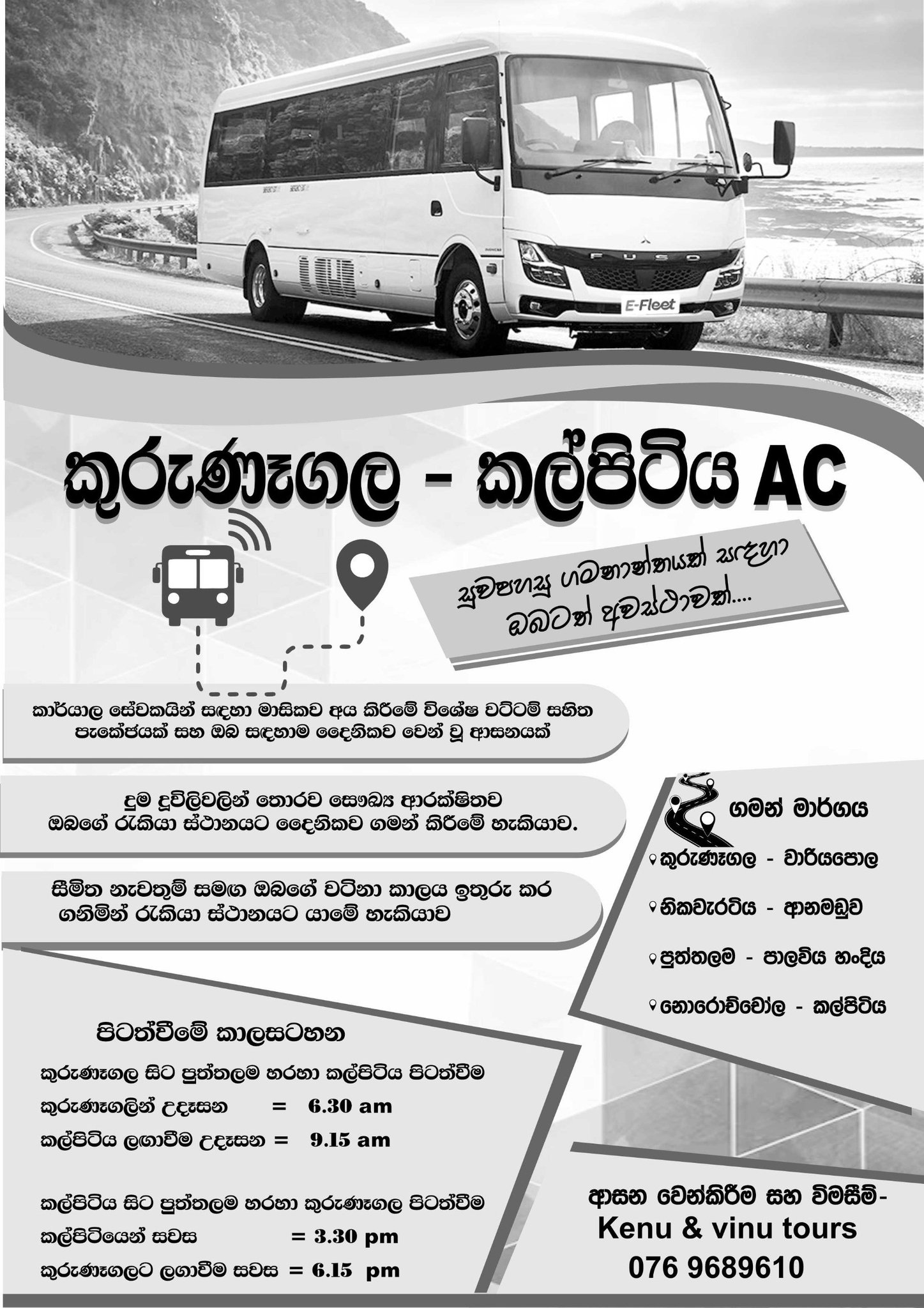 Kurunegala to Kalpitiya Staff Transport Service bus travel via Puttalama having 28 seating capacity with Air Condition facility.