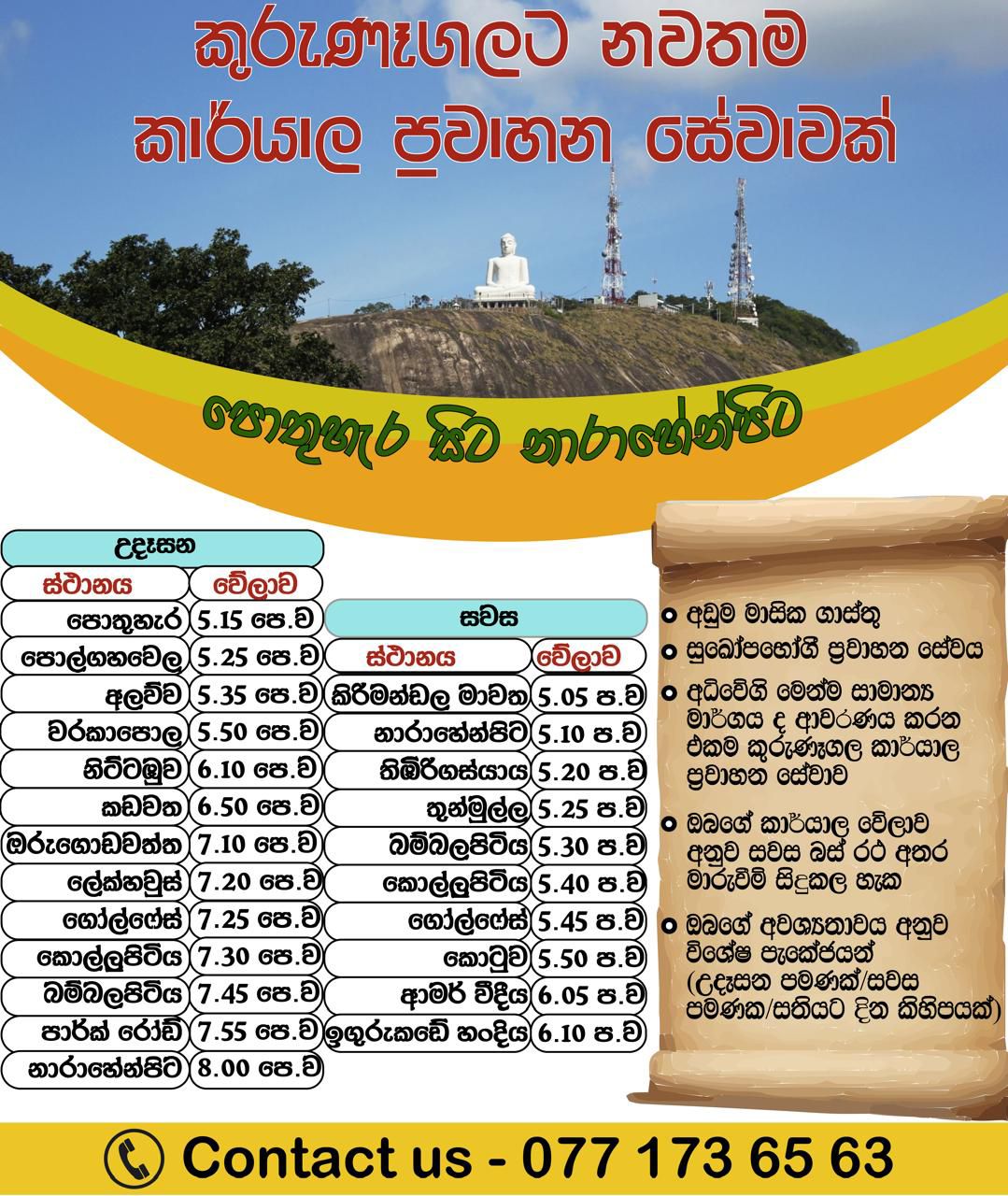 Pothuhera to Narahenpita Staff Transport Service bus travel via Kandy Road having 30 seating capacity with Air Condition facility.